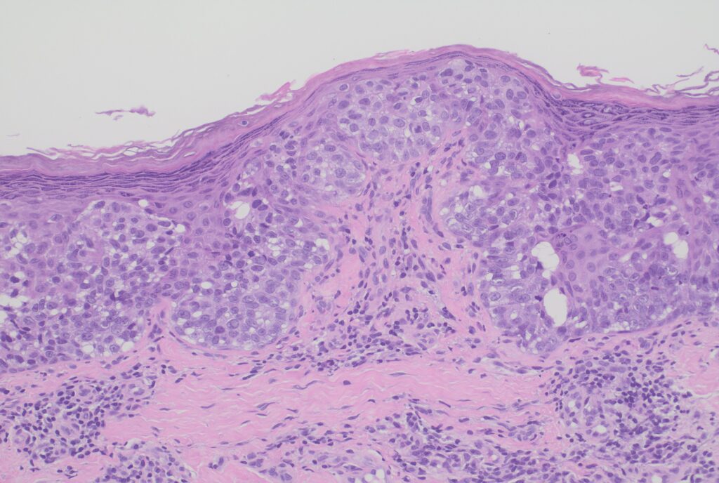 腫瘍は、表皮内に胞体の淡明な細胞増殖を認める.腫瘍細胞の核は中型から大型, 核小体は明瞭化している. 胞体は淡明である.
