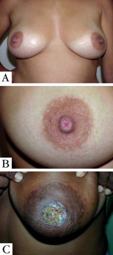 特徴:乳頭・乳輪に湿疹様で、赤く(発赤)、かゆみ(掻痒)、ただれ(びらん)が生じる