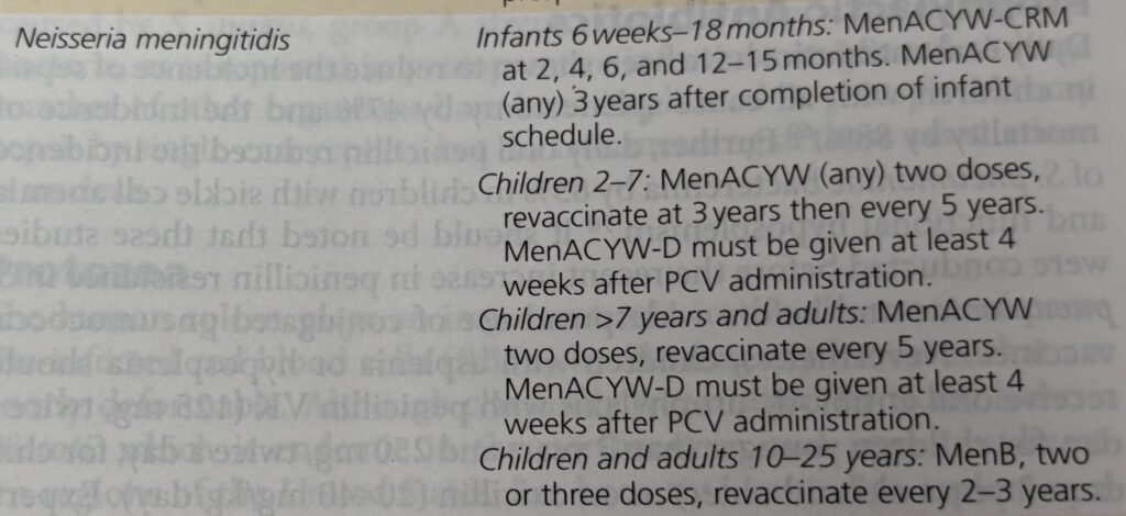 7歳を超える小児および成人(Children >7 years and adults):MenACWYワクチン(メンクアッドフィ)を2回接種し、5年ごとに再接種を行う。MenACWYワクチンの1回目接種から2~3か月後(標準的には8週間後)に2回目を接種する。