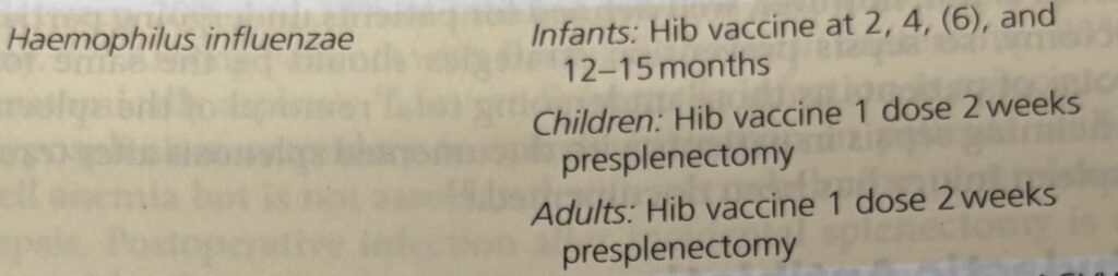 成人(Adults):脾臓摘出術(splenectomy)の2週間前にHibワクチンを1回接種。