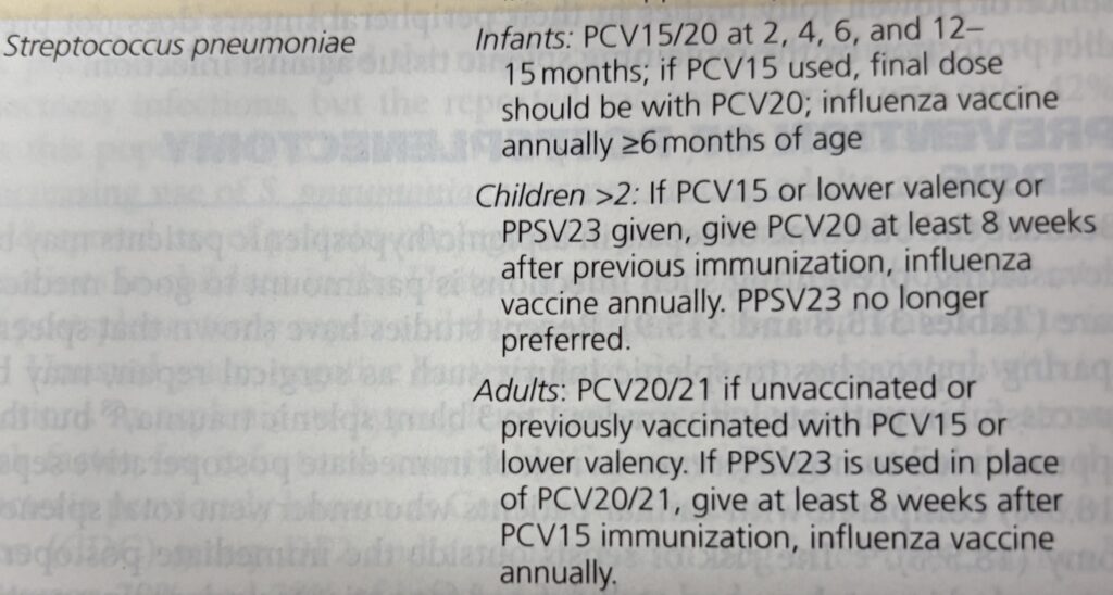 肺炎球菌:成人 PCV20/PCV21 (もしワクチン接種歴なし、または過去にPCV15を接種しているか、あるいは低力価の者)。もしもしPCV20/21の代わりにPPSV23を使用する場合は、PCV15の予防接種から少なくとも8週間後に接種すること。