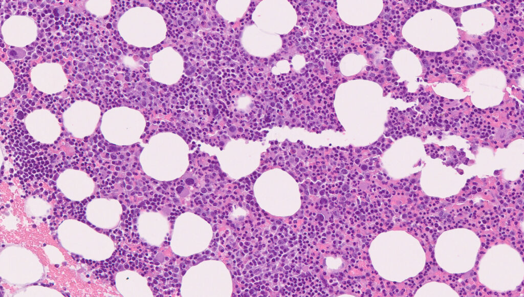 図3 血小板増多を伴うMDS。単核巨核球を多数認める。