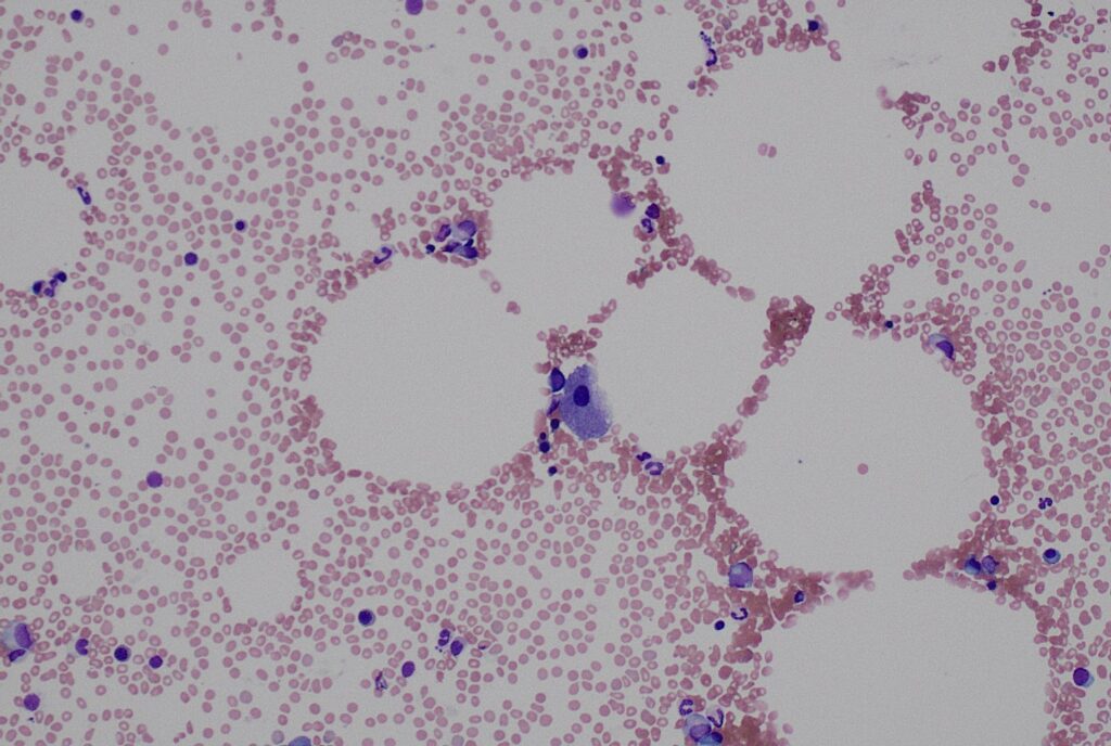図4 MDSで観察された単核の巨核球(中央)。